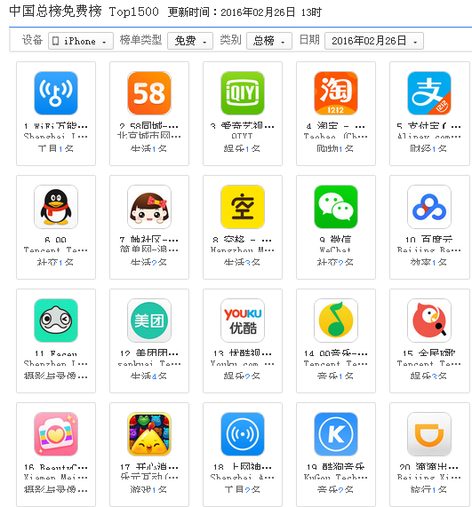 品牌詞:有的開發(fā)者說品牌詞最簡單了,不就一個名字嗎。其實不是這樣的,如果不是有強(qiáng)大的自信,品牌詞我還是建議抱抱大腿,如一款全民開店的APP,如果要抱微信的大腿,它的名字就可以叫微小店、微店等,而副標(biāo)題則可以直接用微信開店真方便,或手機(jī)開店真方便。當(dāng)然,不同性質(zhì)人的APP選擇的大腿對像當(dāng)然也不一樣,這時候我們打開ASO114,查看中國區(qū)總榜免費(fèi)榜Top1500名的APP,總有一款大腿適合你。